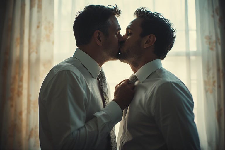After we’ve cleaned up, we go back into the room and get dressed. Movements are efficient now—shirts, buttons, cuffs—like we’re following a script we’ve practiced. I redo his tie, careful and exact. He does my cufflinks, fingers steady, eyes down. When he checks his watch, the moment tightens.