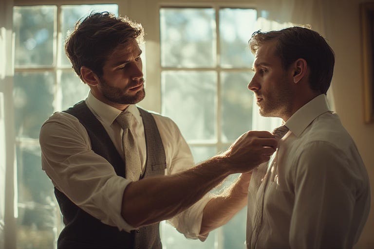 He turns slightly, testing the tie, then looks at himself again. At us, really—our reflections aligned, the same height, the same familiar lines we’ve carried into our thirties. Two men who learned each other early and never quite learned how to let go.