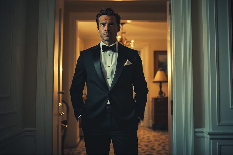 Shep is standing in front of the mirror in his shirtsleeves, tie hanging loose around his neck, cuffs undone. His jacket is draped over the back of a chair like it knows it’ll be needed soon. The room smells faintly like starch and cologne and that clean, anonymous hotel smell that never quite goes away. Outside the door, there’s the low murmur of guests settling—chairs scraping, programs fluttering, a laugh that echoes too long.