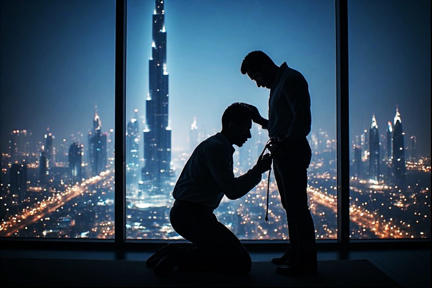 HE POURED THE DRINKS without looking back. One glass for him, one for me. Neat pour, slow hand, like everything he did—controlled. The skyline flared in the window beyond him, Dubai humming against the glass like a living thing. Somewhere out there, the Burj Khalifa reached past the clouds, a needle of light and ego.
